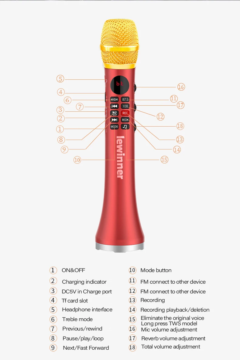 Этот продукт полностью устранил неудобства любителей музыки. Он включает в себя почти все функции предыдущей серии, устройства для пения микрофона. Простота в эксплуатации позволяет использовать Поющие устройства, простота в эксплуатации позволяет вам выполнять показ в любое время в любом месте, с максимальным выходом 20 Вт, а смешанный звук микрофона намного сильнее, которые могут удовлетворить любителей музыки.