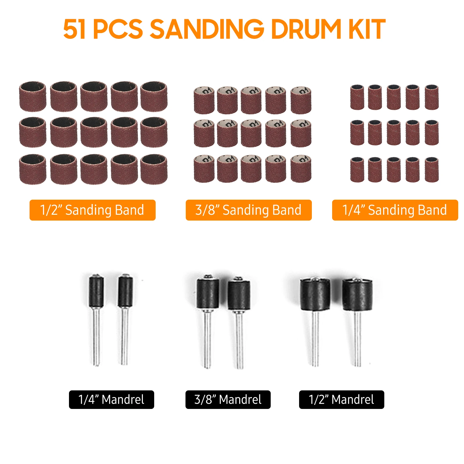 В набор входят 45 штук из 120 зернистой песочной ленты и 6 штук оправки в 3 разных размерах (1/2 ", 3/8", 1/4 ").