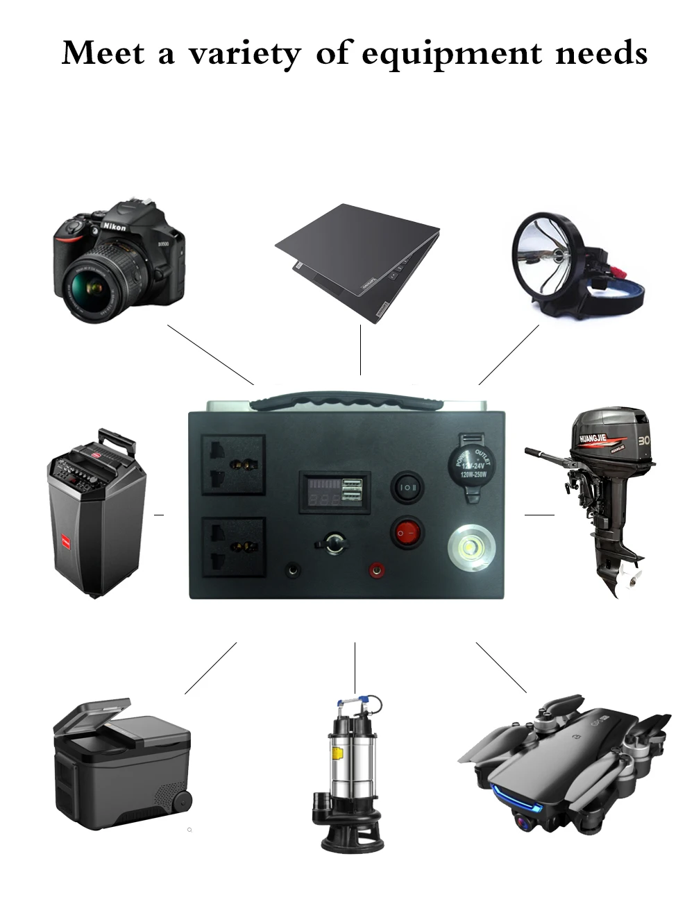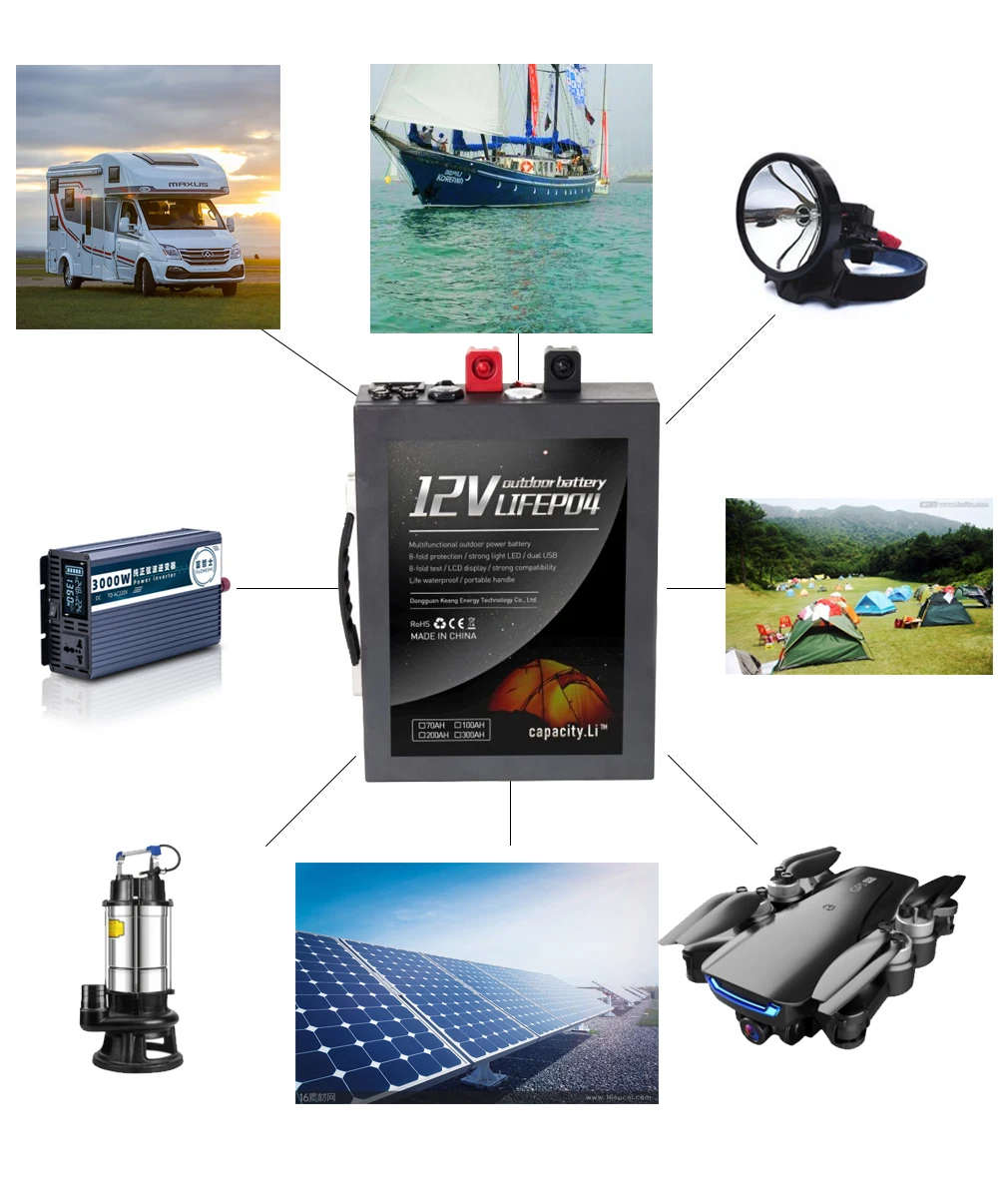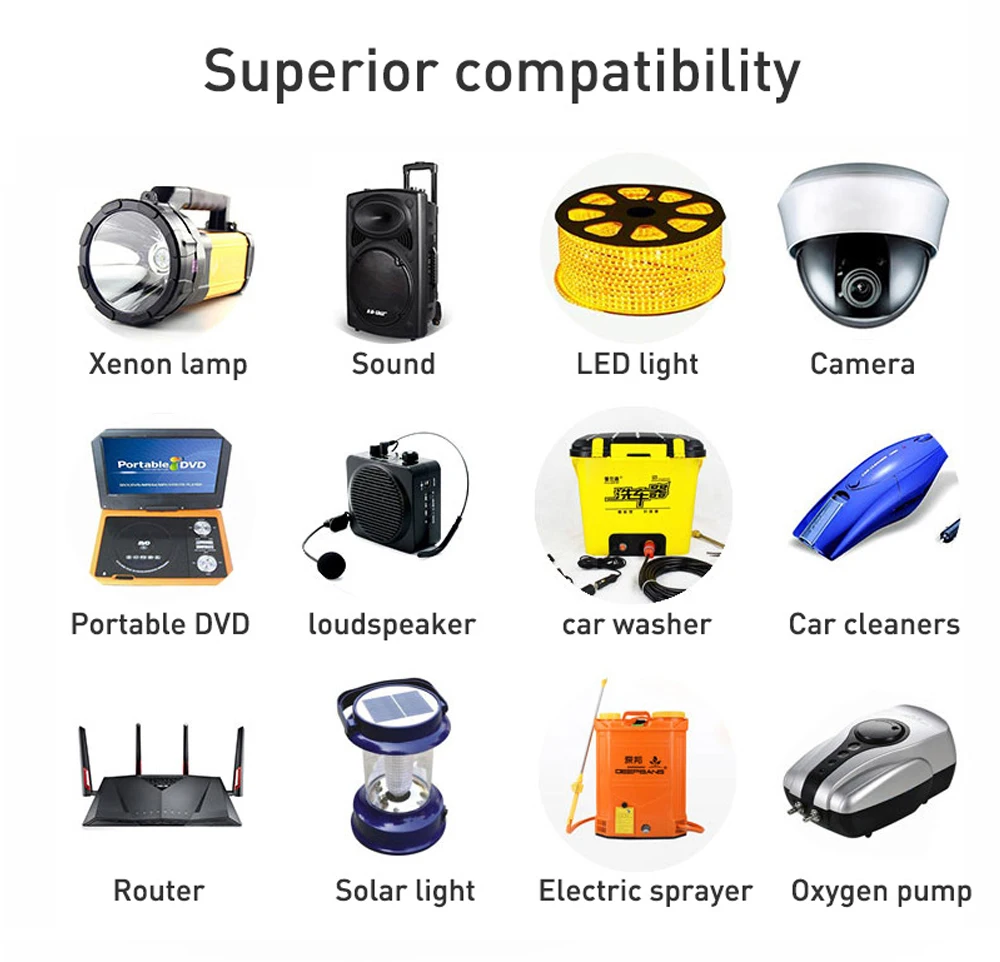 Двигатели, ксеноновые лампы/прожекторы, инверторы, портативные устройства, оборудование для беспроводной связи, оборудование для наблюдения, силовое оборудование, медицинское оборудование, спасательное оборудование, аварийное освещение/светодиодный фонарь, дорожные знаки, портативные мелкие бытовые приборы, электроинструменты, RVs и промышленное оборудование резервного питания и т. Д.