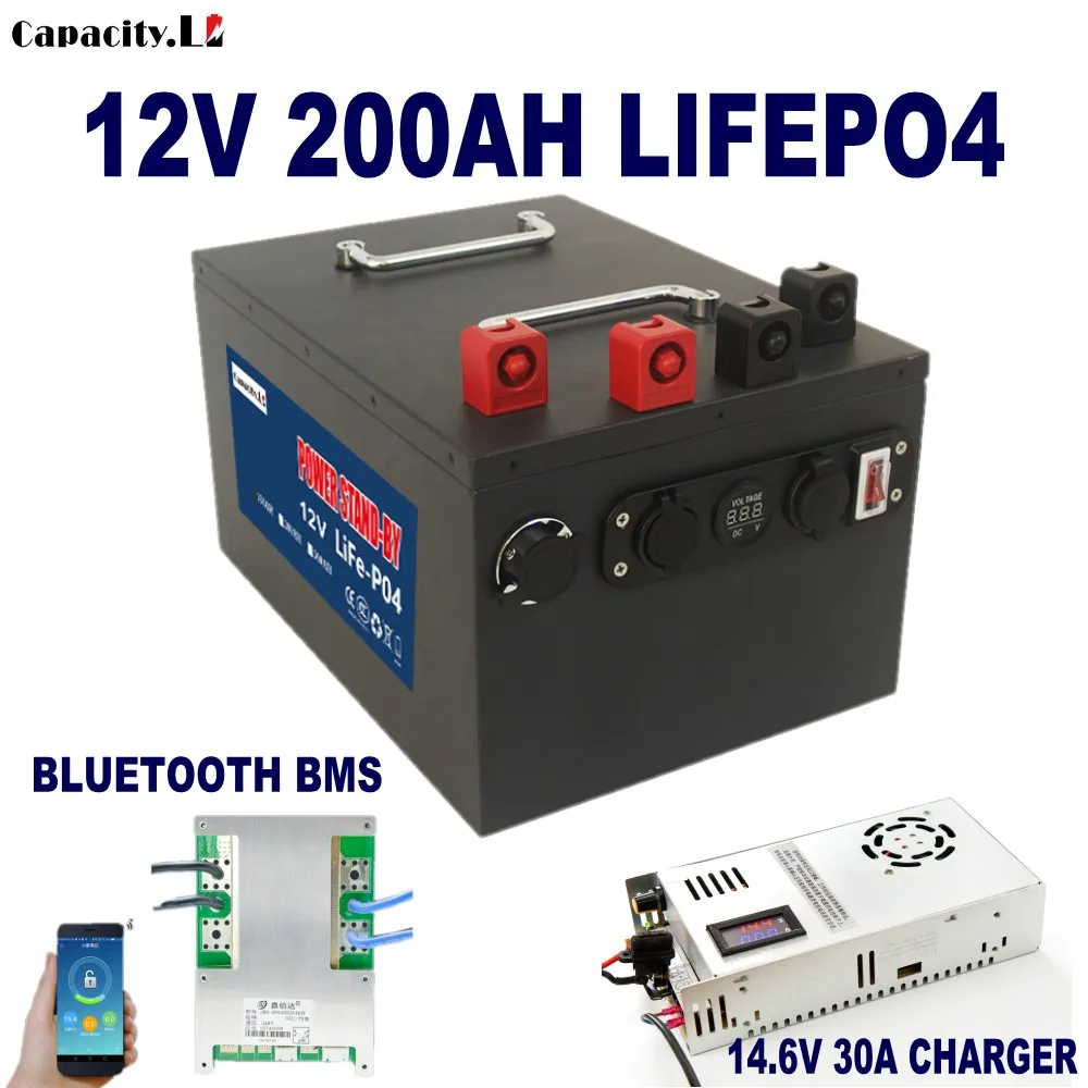 12V 200AH LIFEPO4 с прикуривателем/авиационным зарядным портом/две пары красных и черных терминалов/быстрая зарядка 5V2A (LiFePo4).Зарядное устройство 14,6 в 30A