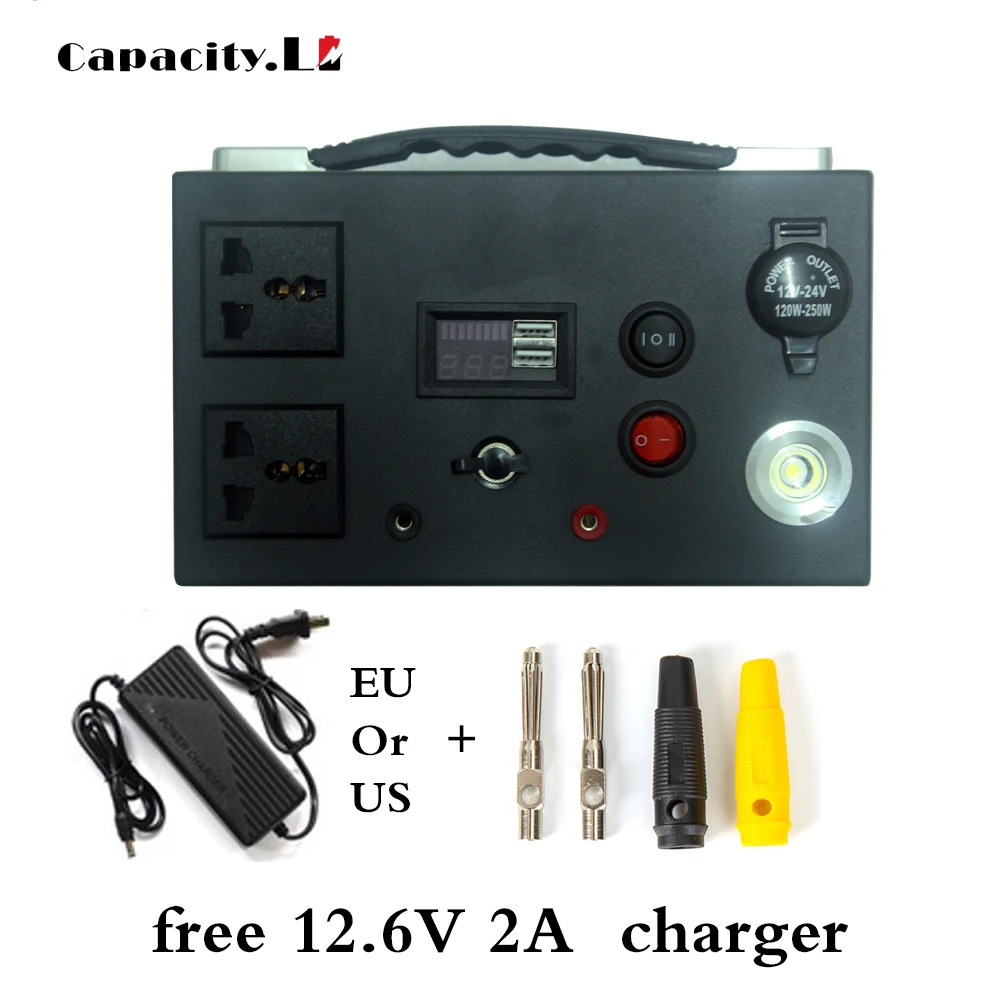 Выход и параметры: высокий ток положительного/отрицательного полюса подключения (красный положительный, черный отрицательный); 220 В инвертор выход универсальная розетка (300 Вт).200AH батарея без инвертора.