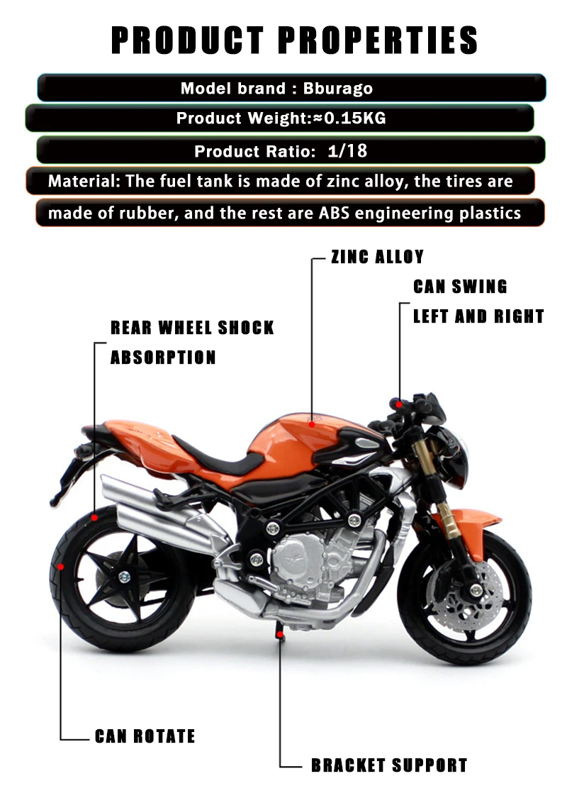 [Название модели] Мотоцикл[Бренд модели] Bburago[Материал модели] цинковый сплав/ABS/Резина[Соотношение модели автомобиля] 1:18[Стандарт упаковки] картонная прозрачная упаковка, модель с базовым дисплеем[Метод обслуживания] при очистке вы можете заполнить немного спирта и протереть его сухой тканью. Не протирайте водой.