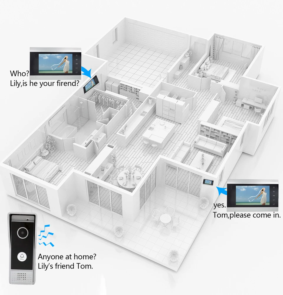 Этот товар является Hands-free и доступен для двусторонней связи. Он поддерживает связь между внутренним монитором и наружной камерой, но также поддерживает связь между монитором и монитором.