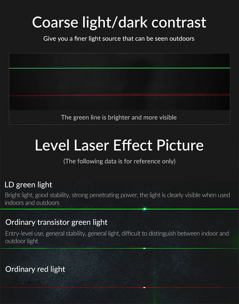 Эти лазерные нивелиры оснащены зеленым лазером LD, подходит для больших или ярких рабочих мест.