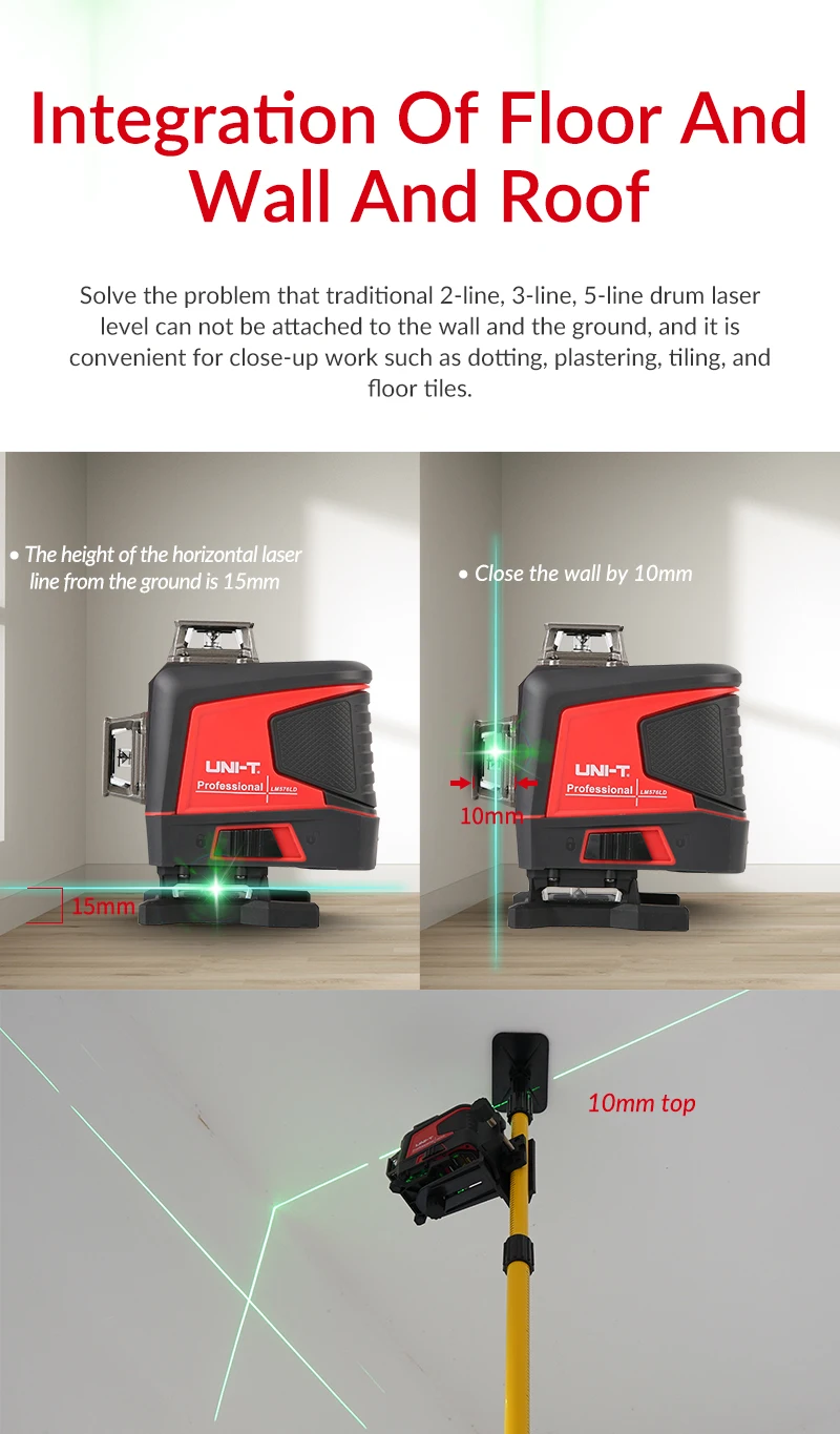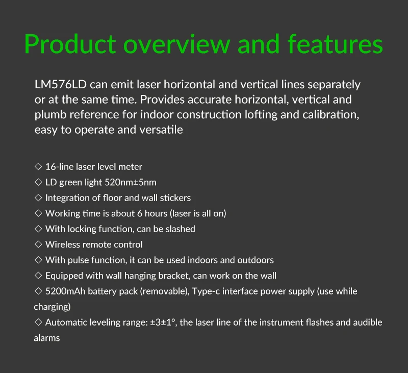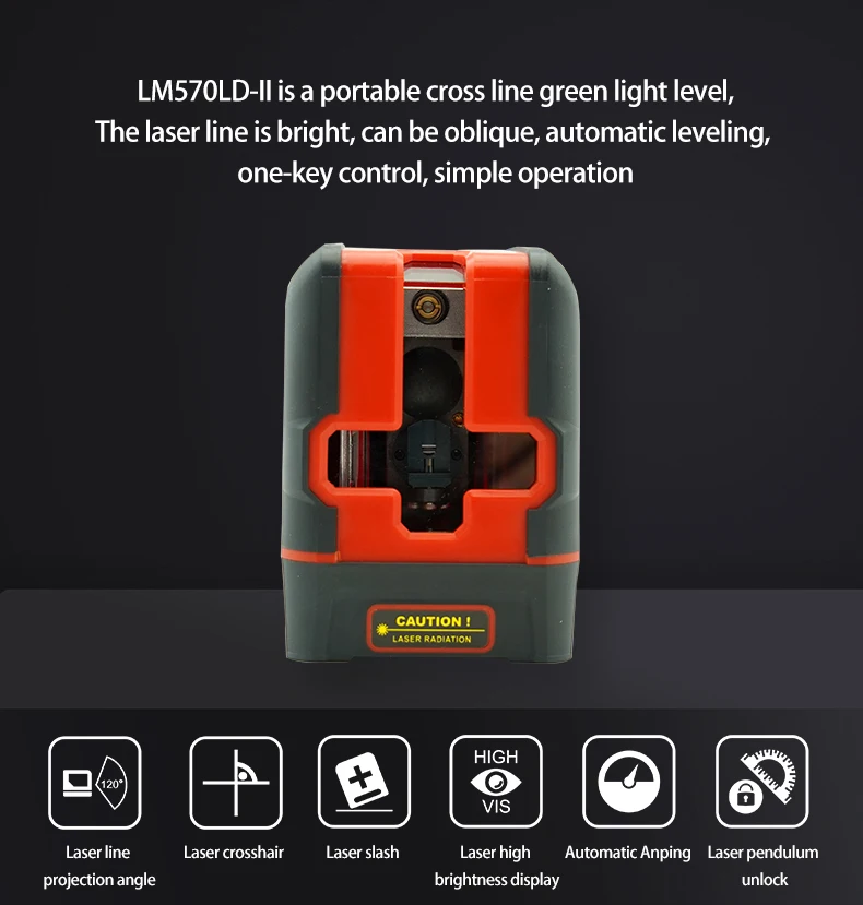 LM570LD-это портативный профессиональный лазерный уровень, который может быть скошен, автоматически выровнен и управляется одной кнопкой. Он используется для внутренней и наружной отделки внутренних стен, стен, лестничных линий, внутренних подъемных, настенных конструкций, установки дверей и окон, отделки потолка.