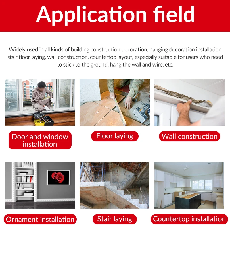 Его применение включает в себя: горизонтальный, вертикальный, поперечный Проецирование для украшения, строительство зданий, украшение дома, ремонт, установку мебели, напольное покрытие и планировку проекта.