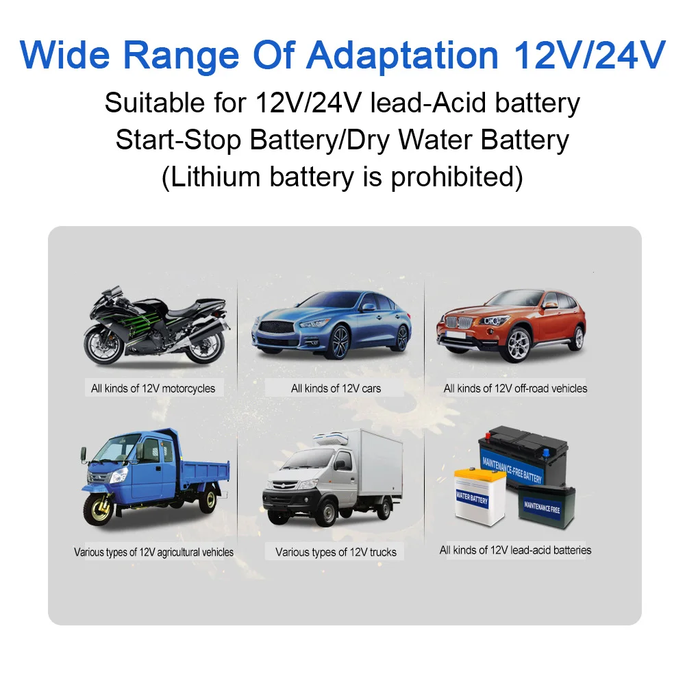 Features:Microprocessor Control (CPU). This is a fully automatic battery charger with 7 charge stages.Automatic charging protects your battery from being overcharged. So you can leave the charger connected to the battery indefinitely.7-stage chargers are suitable for most battery types including Calcium, Gel AGM, LiFePo4, Wet, lead Acid batteries. They may also help restore drained and sulphated batteries.Types of batteries: Most types of lead acid batteries including Calcium, Gel AGM, LiFePo4, Wet, lead Acid, etc.