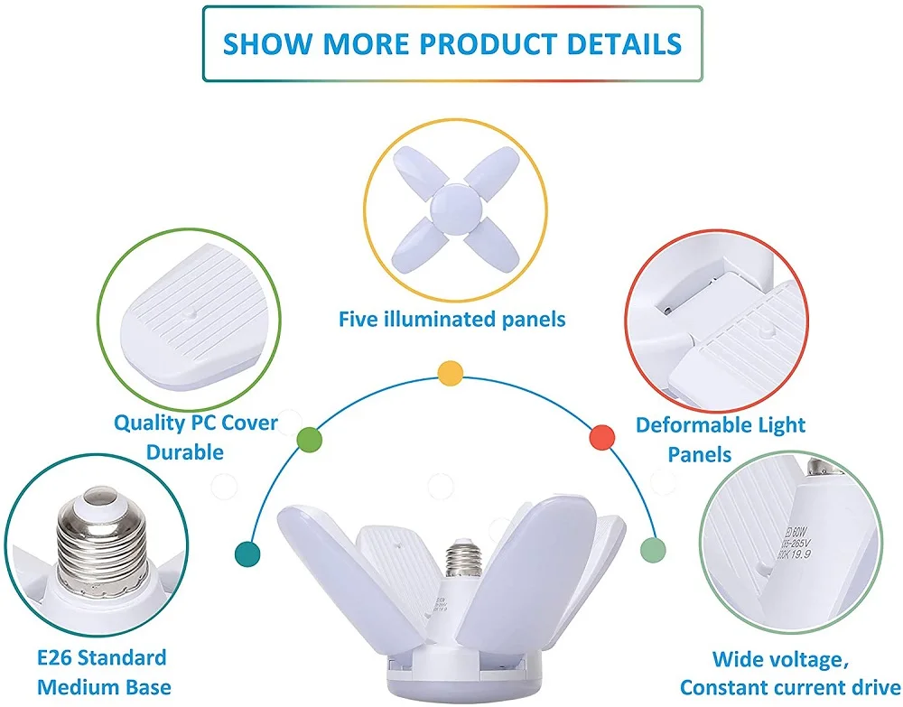 【Деформируемый дизайн 】четыре светодиодный головки панели могут быть отрегулированы, уникальный широкоугольный светодиодный дизайн гаражного освещения, каждая световая головка может быть сложена до 90 °. Максимальный угол покрытия может достигать 360 °, это сделает светильник более широким. Освещение регулируется так, что вы можете угол светодиодов, чтобы светить там, где вы хотите их.