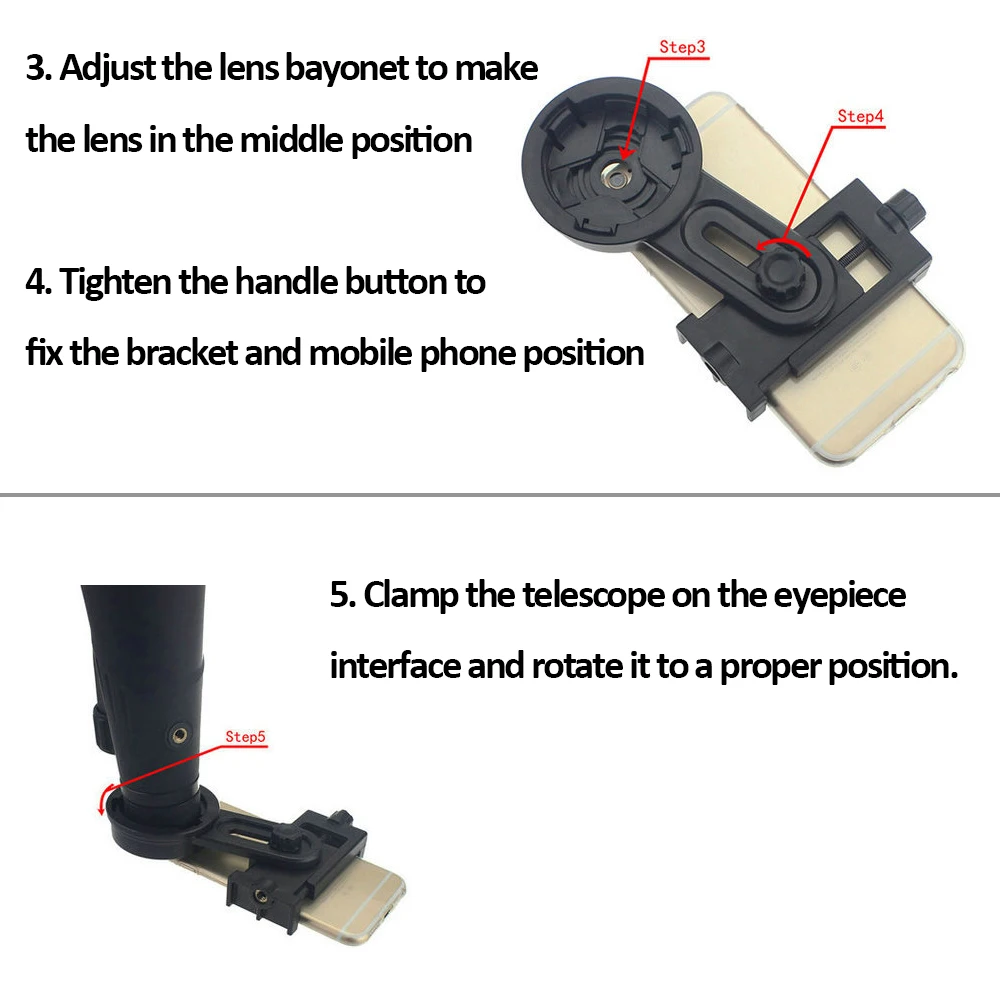 3. Простой в использовании; Поместите телефон в адаптер, поместите камеру телефона в центр над окуляром и используйте ручки, чтобы закрепить адаптер на месте