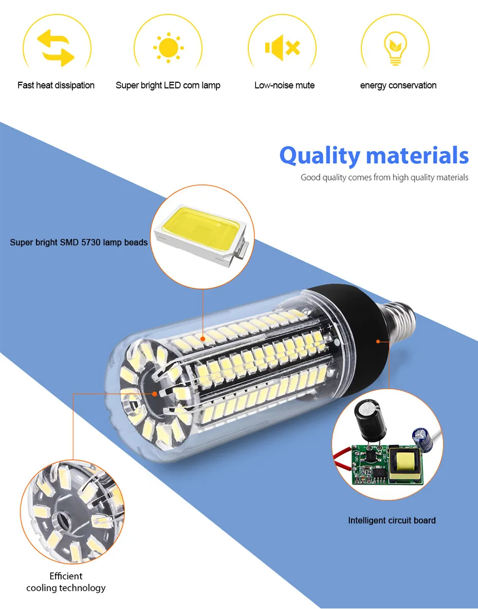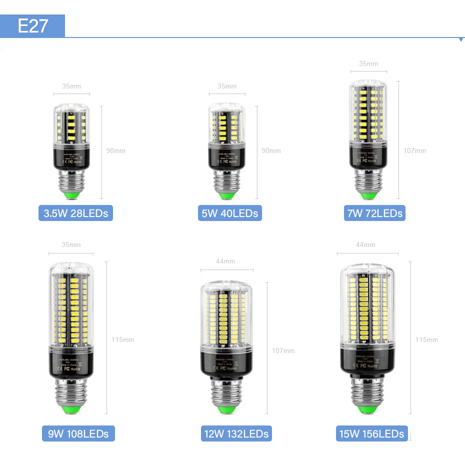 Параметры: Тип цоколя: E27/E14 Напряжение: AC85V-265V Материал: алюминиевая печатная плата Мощность: 3,5 Вт/5 Вт/7 Вт/8 Вт/12 Вт/15 Вт Световой поток: 328LM (3,5W); 500лм (5 Вт); 800лм (7 Вт); 900лм (8 Вт); 1200лм (12 Вт); 1277лм (15 Вт) Тип светодиодный: 5736SMD (золотой чип, кронштейн из чистой меди) CRI: >85 Угол луча: 360 ° Сертификаты: CE, ROHS Цветовая температура: теплый белый (2800-3500K); Белый (5500-6000K) Особенности: * Ультра-яркий светодиодный светильник для кукурузы. * Безопасный и эффективный. Лучшее энергосбережение, низкое тепло и низкое энергопотребление. * Длительный срок службы, высокая светоотдача. * Отличное снижение выбросов углерода, экологически чистый. * Твердое состояние, ударопрочный. Прочное жаростойкое стекло. * Без VU и ИК-излучения. Нет свинца, ртути и других элементов загрязнения. * Подходит для домашнего использования, офиса, магазина, ресторана, выставки, залов, музейного отеля.