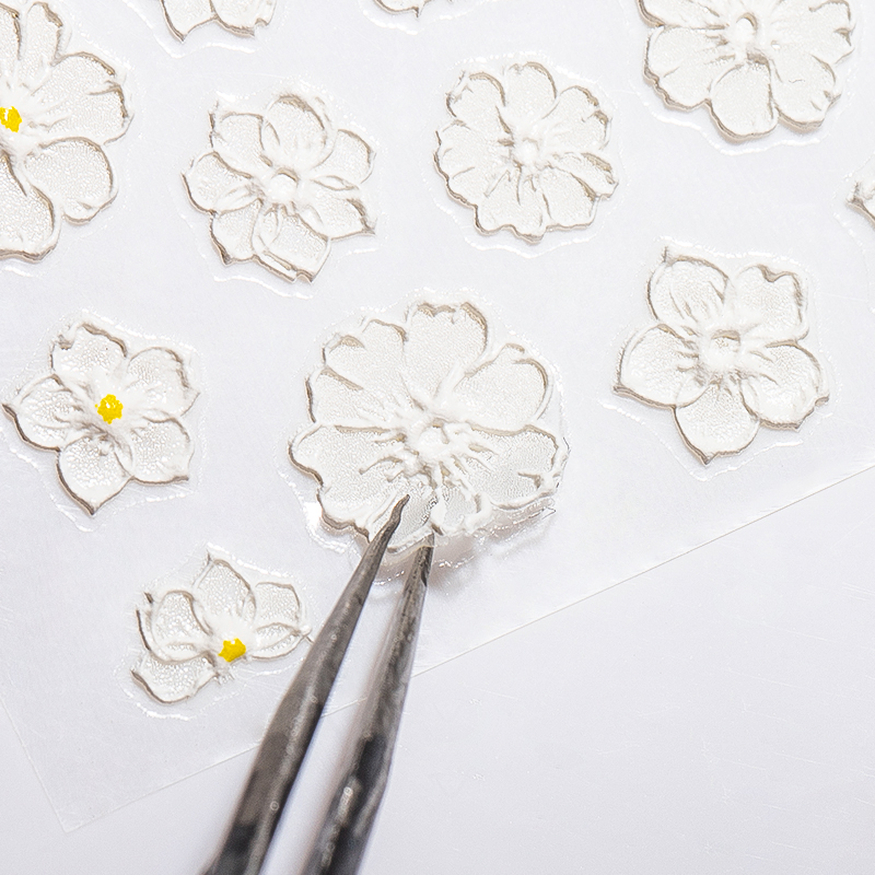 4. Используйте пинцет, чтобы аккуратно удалить подготовленную наклейку, поместите ее на ноготь и