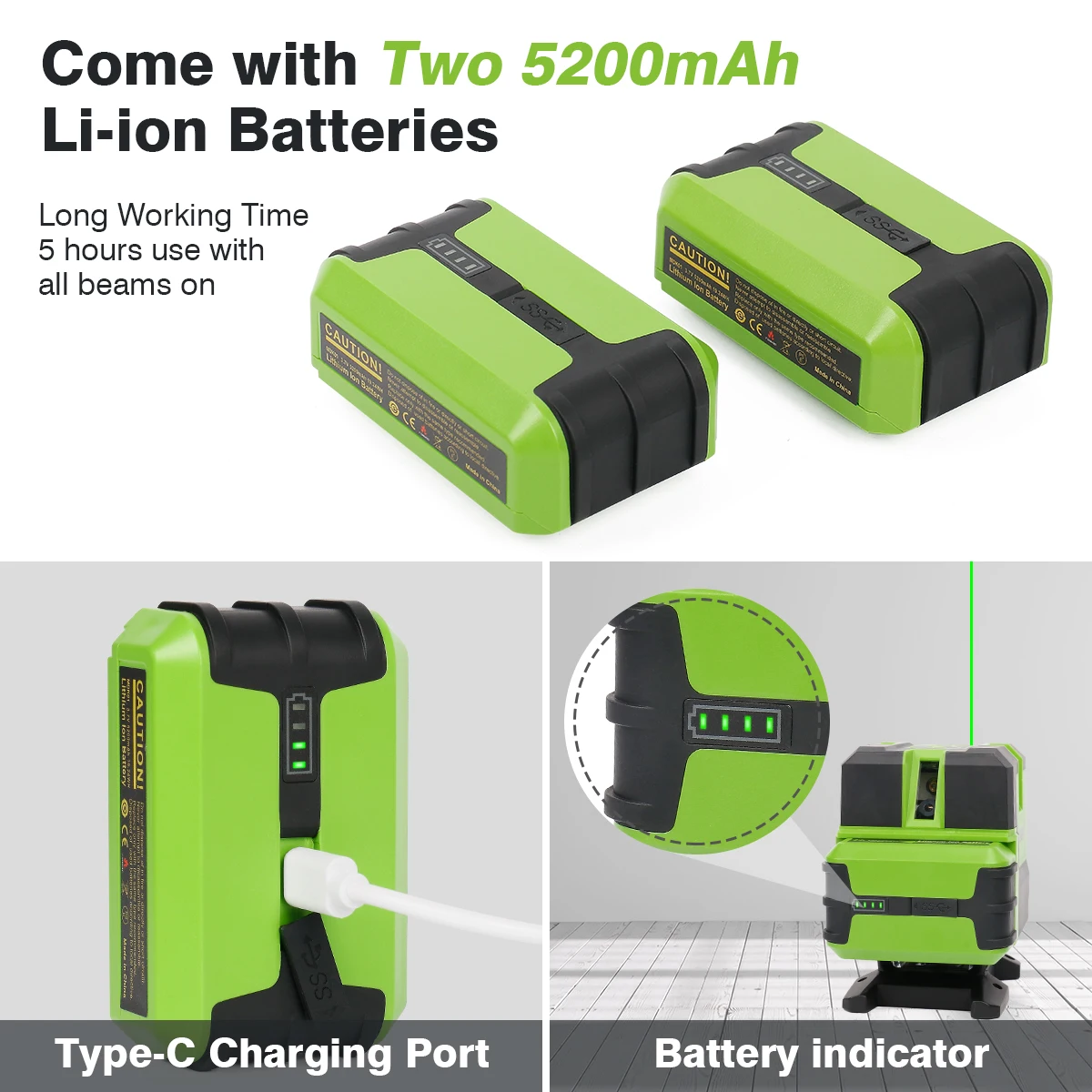 Этот лазерный инструмент использует 3,7 V / 5200 мА/ч, большая емкость литий-ионный аккумулятор. Дополнительный аккумулятор включен в посылка для резервного копирования.