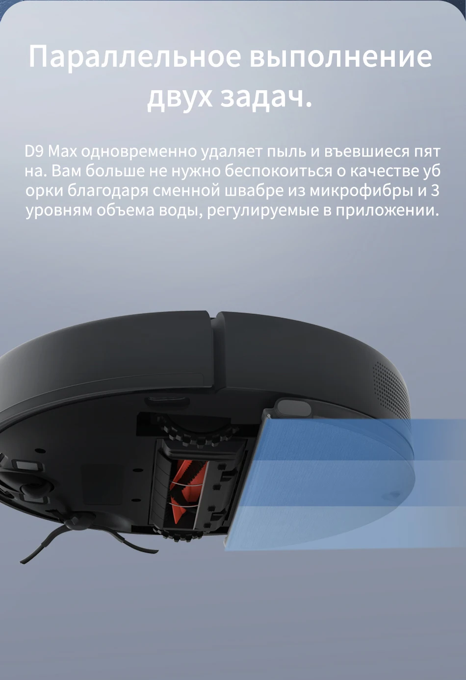 D9 Max удаляет грязь или пятна сразу. Многоразовые прокладки из микрофибры для очистки и регулируемые 3 уровня объема воды в приложении предлагают беспроблемную очистку.