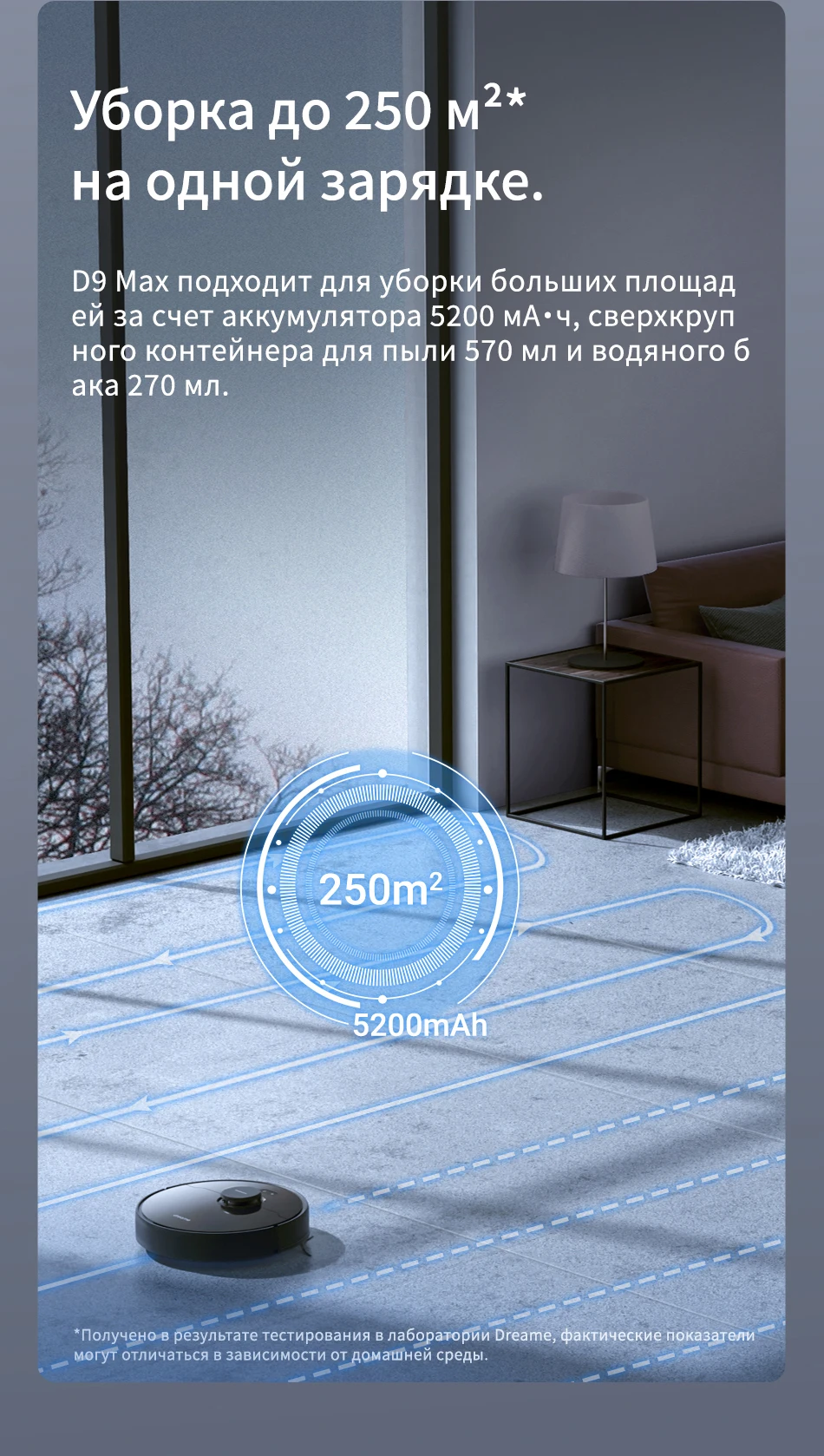 Очищает до 250m2 (2690ft2)* на одной зарядке.