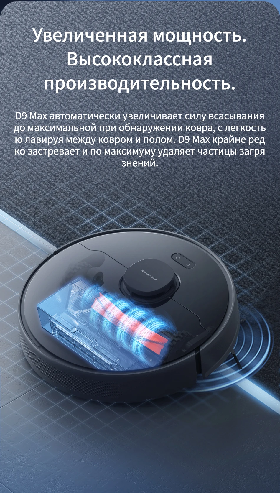 D9 Max автоматически увеличивает до максимальной мощности всасывания при обнаружении ковров. Он легко проходит между коврами и полом, редко застревает и улавливает большинство частиц.