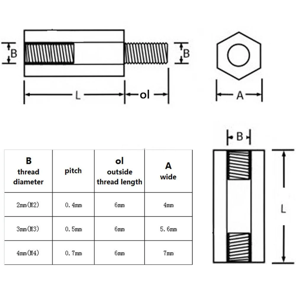 Описание товара Есть 50 шт M2 M3 M4 нейлоновая Шестигранная прокладка или винт или гайка Материал: Нейлон Размер: Наружная Прокладка: M2 / M3 / M4 * L (Длина прокладки) + 6 мм (наружная длина резьбы) Женская распорка: M2 / M3 / M4 * L (длина Распорки) Винт: M2 / M3 / M4 * L (длина резьбы) Метрический Диаметр резьбы: 2 мм (м2)/3 мм (м3)/4 мм (M4) Метрический Шаг резьбы: 0,4 мм (M2) /0,5 мм (M3) /0,7 мм (M4)