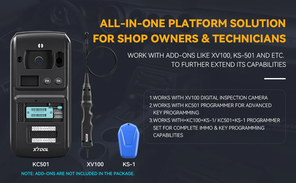 В качестве продвинутого диагностического сканера компьютера, XTOOl A80 Pro Master может работать с дополнениями, такими какЦифровая Инспекционная камера XV100Для проведения инспекции на труднодоступных местах, таких как цилиндры двигателя, работает сKC-501 программатор для ключейИлиKC-501 + KS-1 ключ набор программистаДля выполнения комплексных функций IMMO и усовершенствованных функций программирования и программирования чипов ключей и превращения их в инструмент для автоматического блокировки-smith.