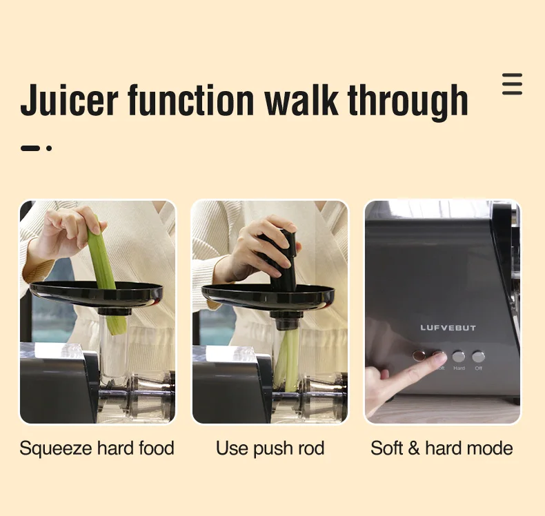 Медленная Массажная Соковыжималка проста в использовании. Есть две кнопки на соковыжималке, вы можете нажать на мягкую или жесткую кнопку, чтобы сделать сок. Вы можете использовать соковыжималку, чтобы получать сок каждый день.