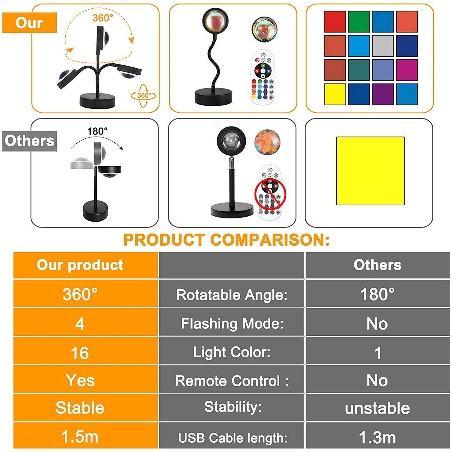 Головка лампы заката может поворачиваться на 360 градусов, она может производить различные огни под разным углом, создавать блестящую атмосферу, наслаждаться красотой разных цветов. Вращающийся светильник может изменить размер и форму прожектора Ночной светильник.