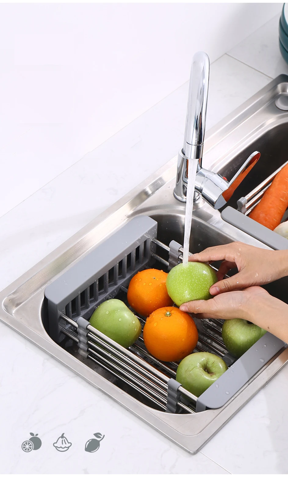 【Размер изделия 】 Размер диска составляет 28 см * 23 см * 9 см, который может быть телескопически увеличен между 28 см до 47 см ", подходит для большинства кухонных раковин.