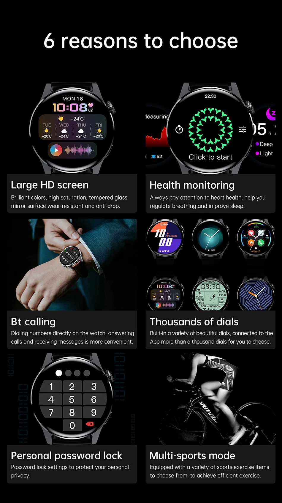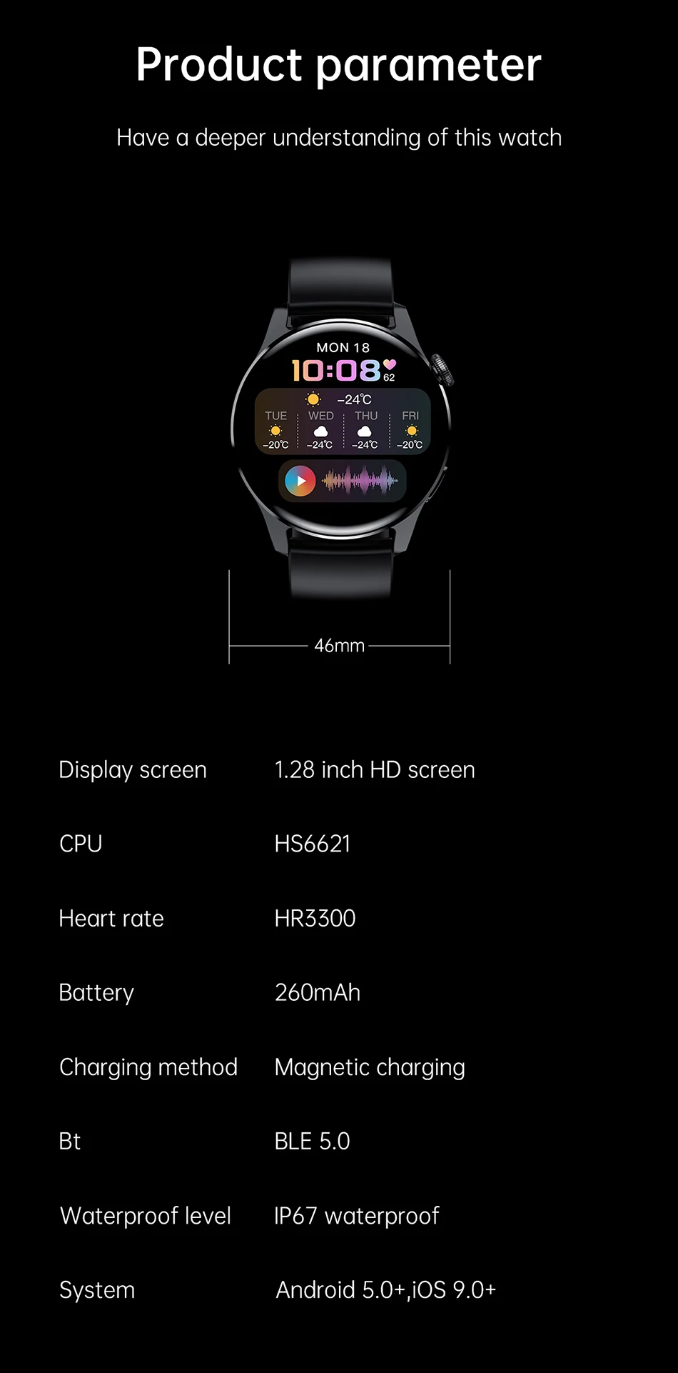 Приложение для напоминания информации имеет функцию включения переключателя (ответ/совершение звонков поддерживает подключение на мобильный телефон, чтобы смотреть звонки и слушать песни, мониторинг сердечного ритма, Мониторинг Артериального давления/кислорода в крови, мониторинг сна, шагомер для упражнений/потребление калорий/время выполнения упражнений, напоминание о звонках и отображение сообщений push and display дистанционное управление автоматически проверяет частоту сердечных сокращений, фотографируя. Мультиспортивный режим. Напоминание о малоподвижности. Будильник настроен на 5 видов циферблатов по умолчанию, и приложение может быть настроено.