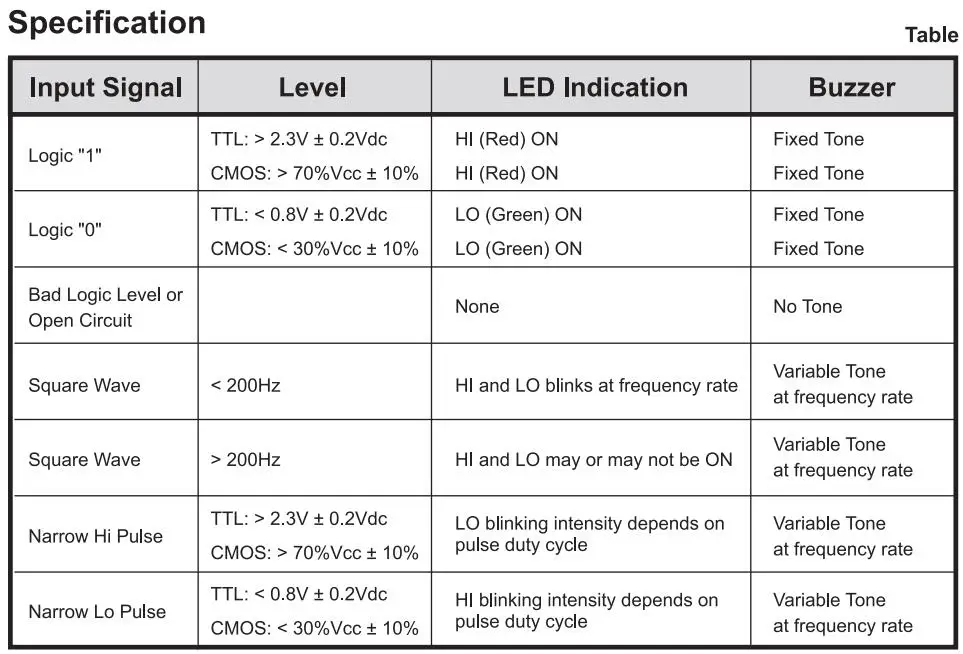 Это устройство является логическим инструментом для устранения неполадок, который дает визуальный (светодиодный светильник) и звуковые показания для логических уровней и импульсов.