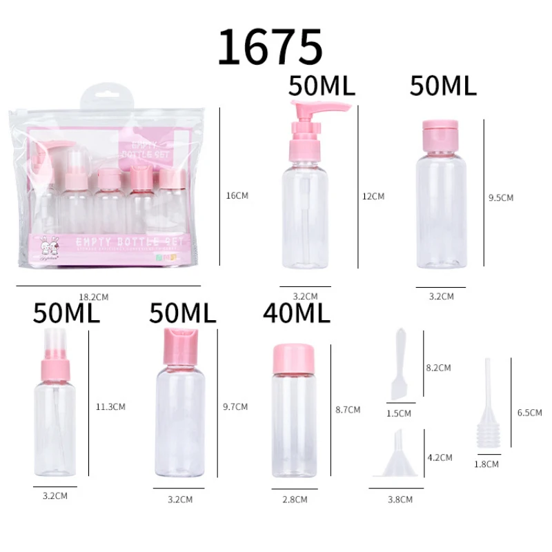 Количество: 2 * бутылка с длинным горлом, 1 * бутылка с распылителем, 2 * бутылка для крема, 2 * бутылка для лосьона