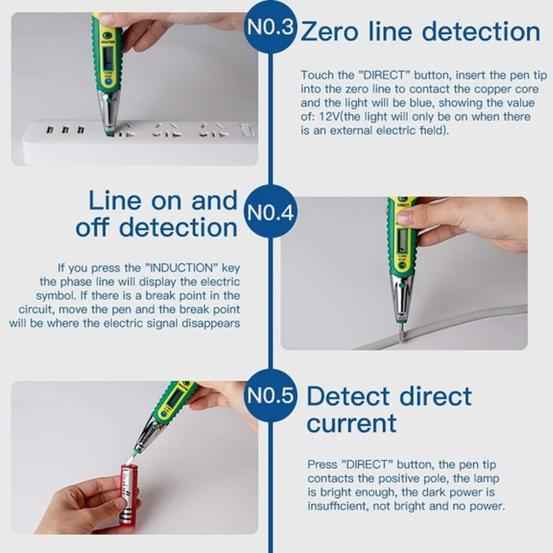 <Многофункциональность: Может использоваться в качестве ручки для проверки напряжения. Подходит для detecting12-220V переменного и постоянного тока и просто обнаруживает null line, live line и точку останова переменного тока.