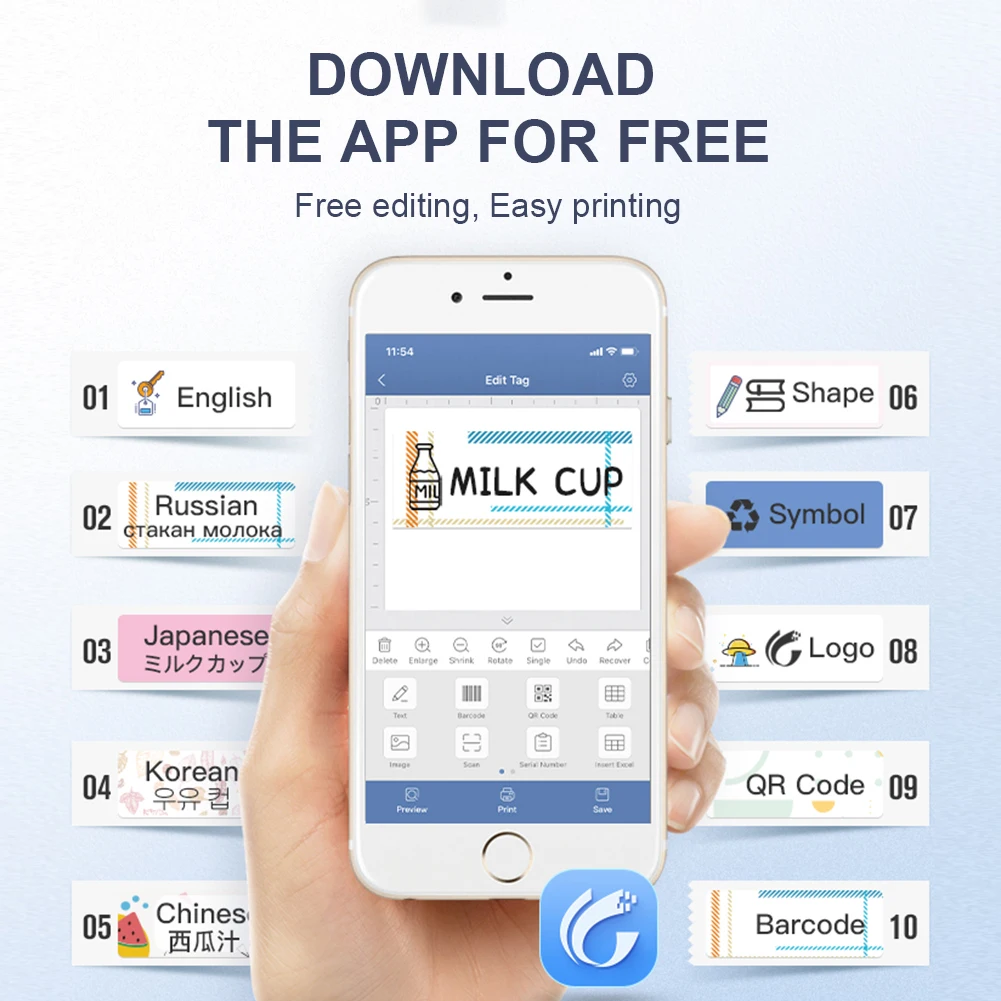 Мощные функции. Портативный производитель этикеток поддерживает печать различных текста, цифр, графики, символов, логотипов, штрих-кодов, qr-кодов и т. д. и интеллектуальное распознавание голоса и изображений.