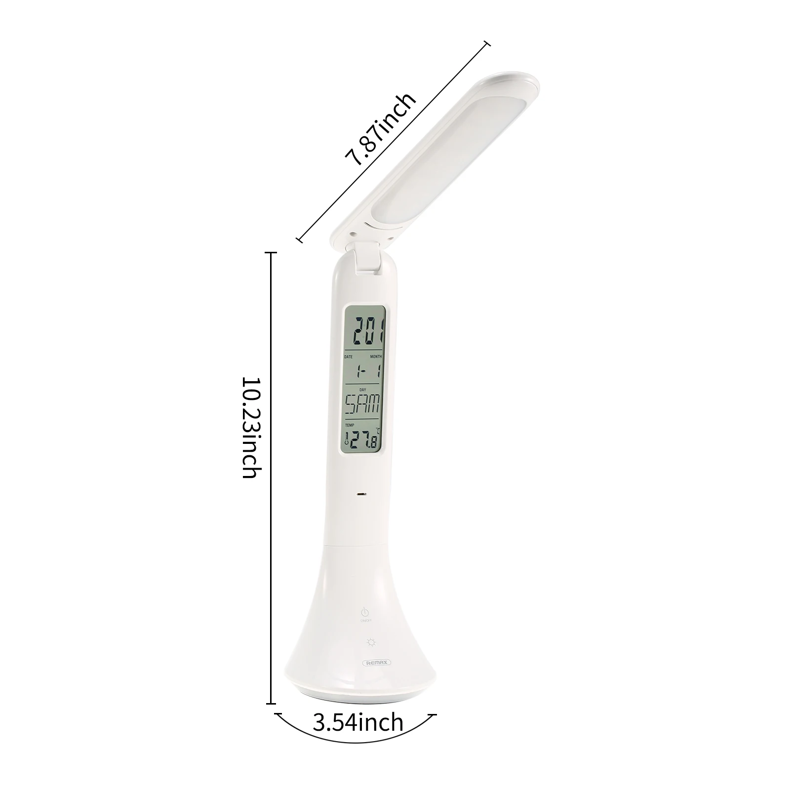 Светодиодный светильник можно сложить на 180 °, вы можете взять его куда угодно, идеально подходит для офиса, школы, дома и библиотеки. Настольная лампа со временем, календарем, неделей, температурным ЖК-дисплеем для удовлетворения различных потребностей во всех случаях, идеально подходит для учебы, работы.