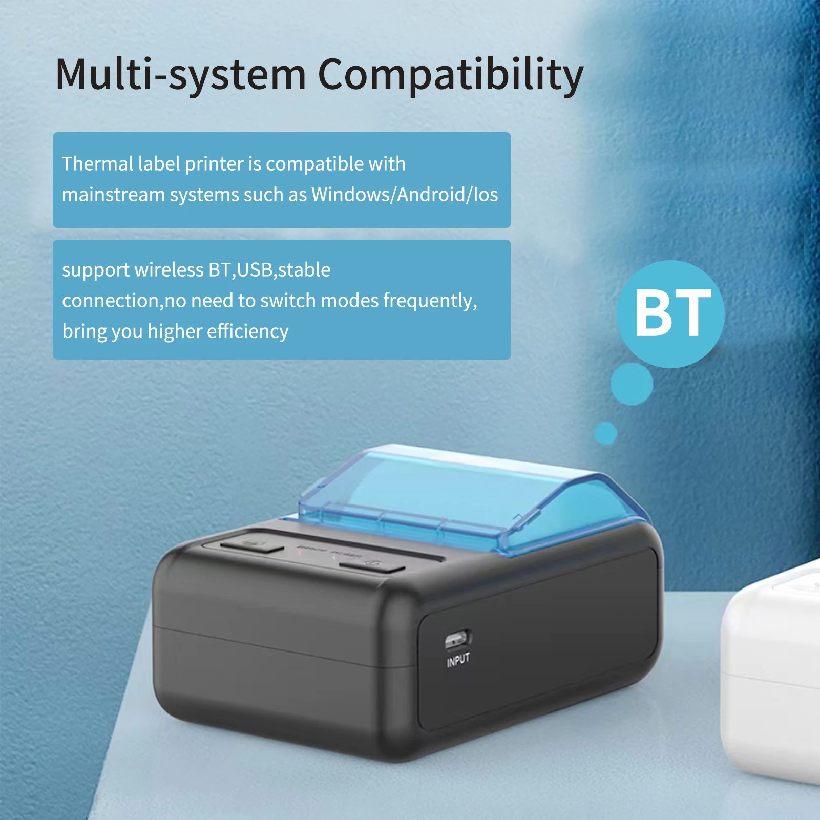 Совместимость с несколькими системами:Термальный принтер этикеток совместим с основными системами, такими как win 10/8/7, поддержка беспроводных BT,USB, стабильное соединение, не нужно часто переключать режимы, повышает эффективность.