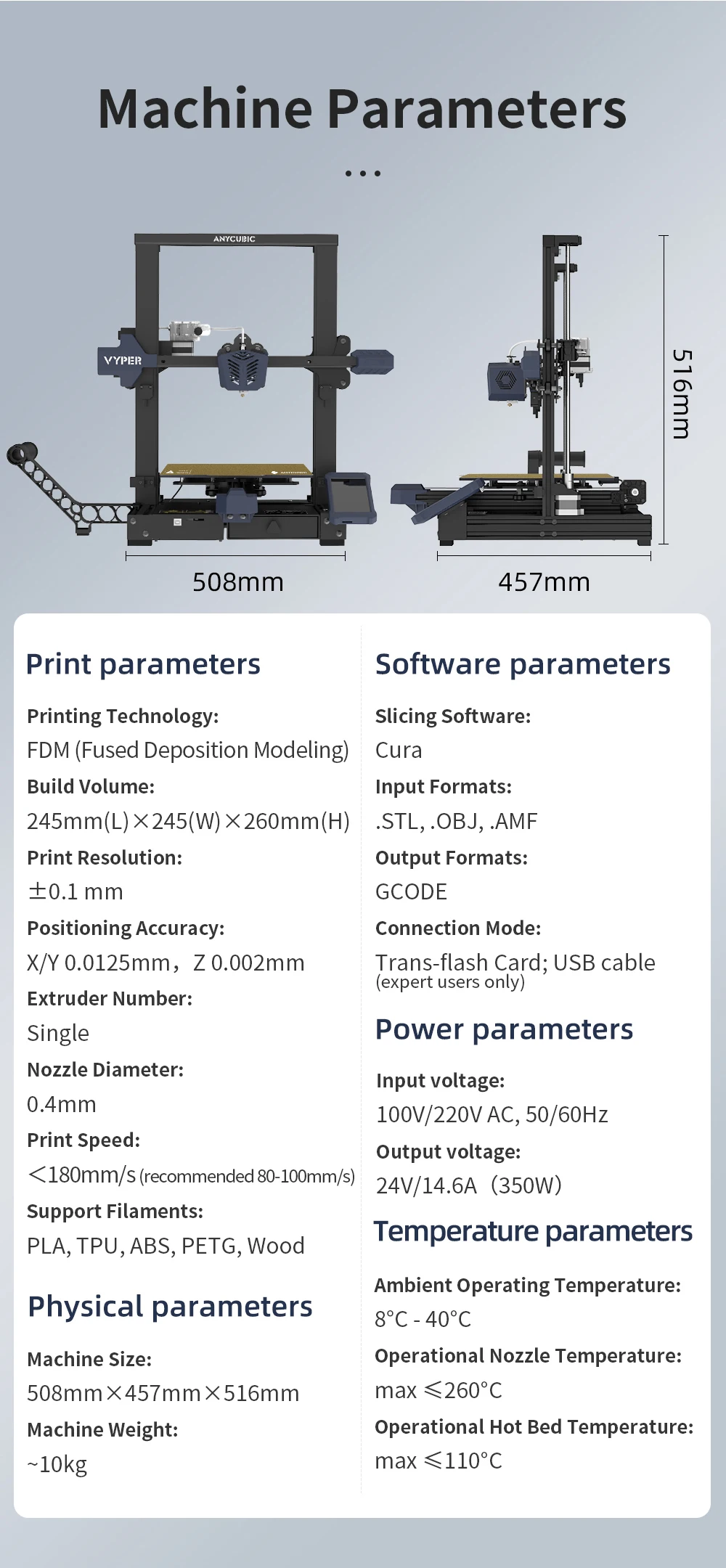 Оснащен новая 32-битная материнская плата и высокопроизводительный Cortex -M3 архитектура основной чип управления, Vyper имеют более высокую скорость вычислений и более гладкой. Интеграция TMC2209 silent driver делает материнскую плату бесшумной печатью и точным контролем выходного напряжения, что обеспечивает более точную и бесшумную печать.