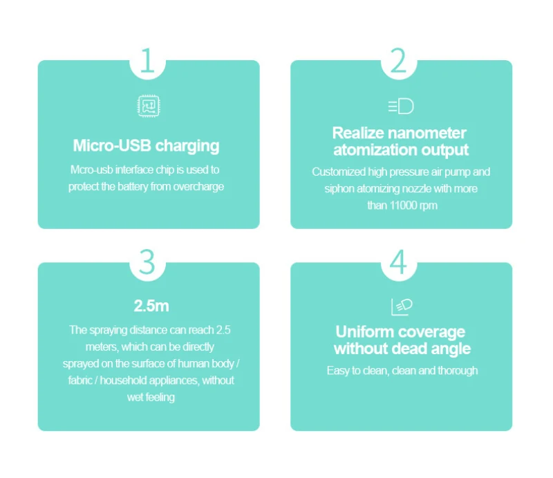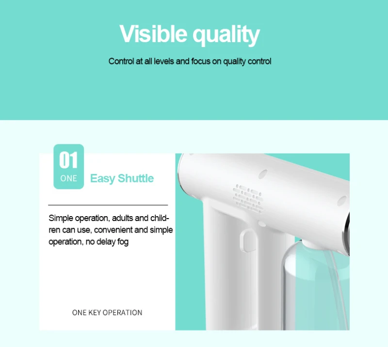 1. Высококачественный нано-распылитель, использование термостойкого материала ABS, быстрое запотевание, большое количество тумана