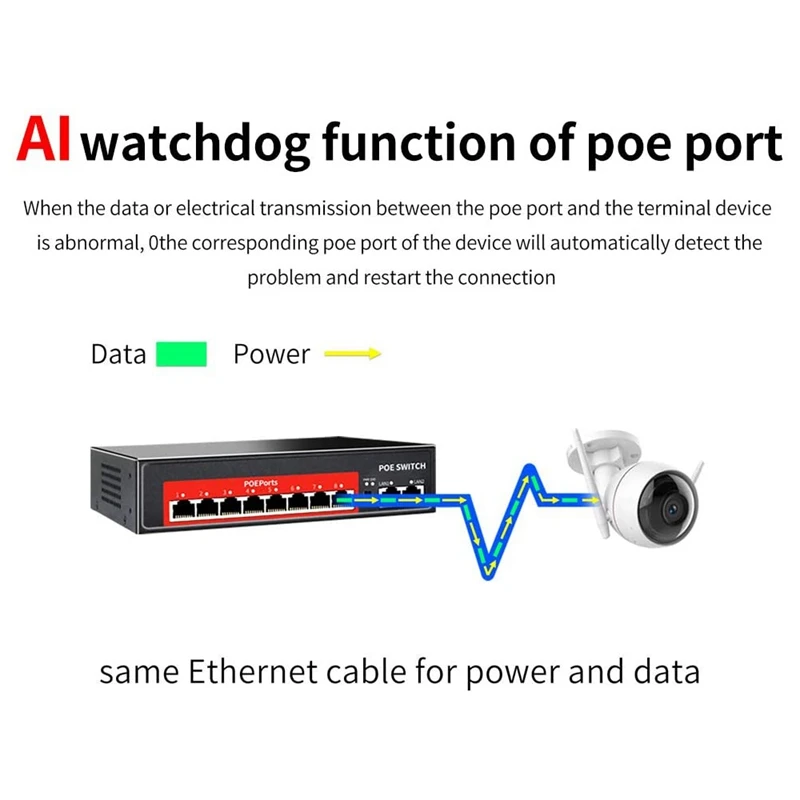 [Функция AI Watchdog порта poe] Когда данные или электрическая передача между портом poe и терминальным устройством являются ненормальными, соответствующий порт poe устройства автоматически обнаруживает проблему и перезагружает соединение.