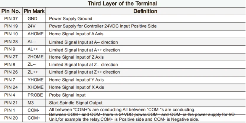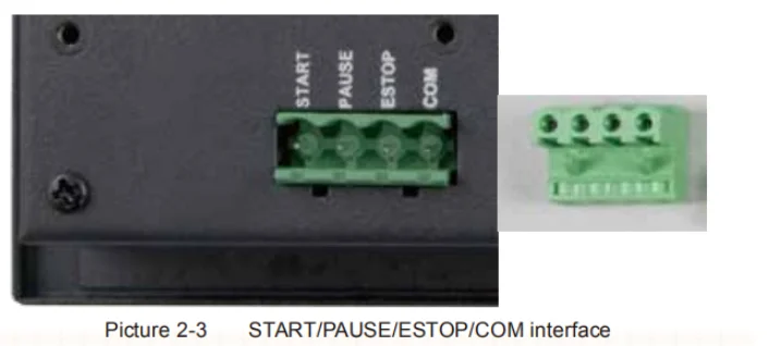 Как показано на рисунке 2-3, интерфейс питания, есть винт termimal для подключения. Отметки-«СТАРТ»/«пауза»/«ESTOP» и «COM» для внешних переключателей. И изображение 2-4-это схема для подключения.