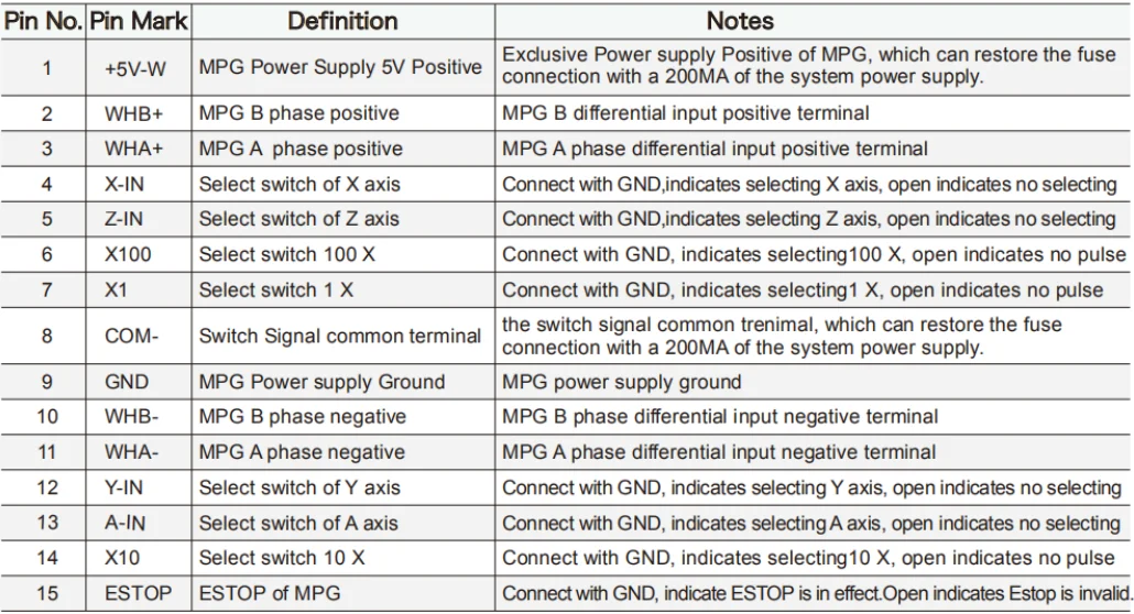 Пользователям необходимо приварить кабели MPG к клемме DB15 и подключить к порту MPG порта контроллера MPG.