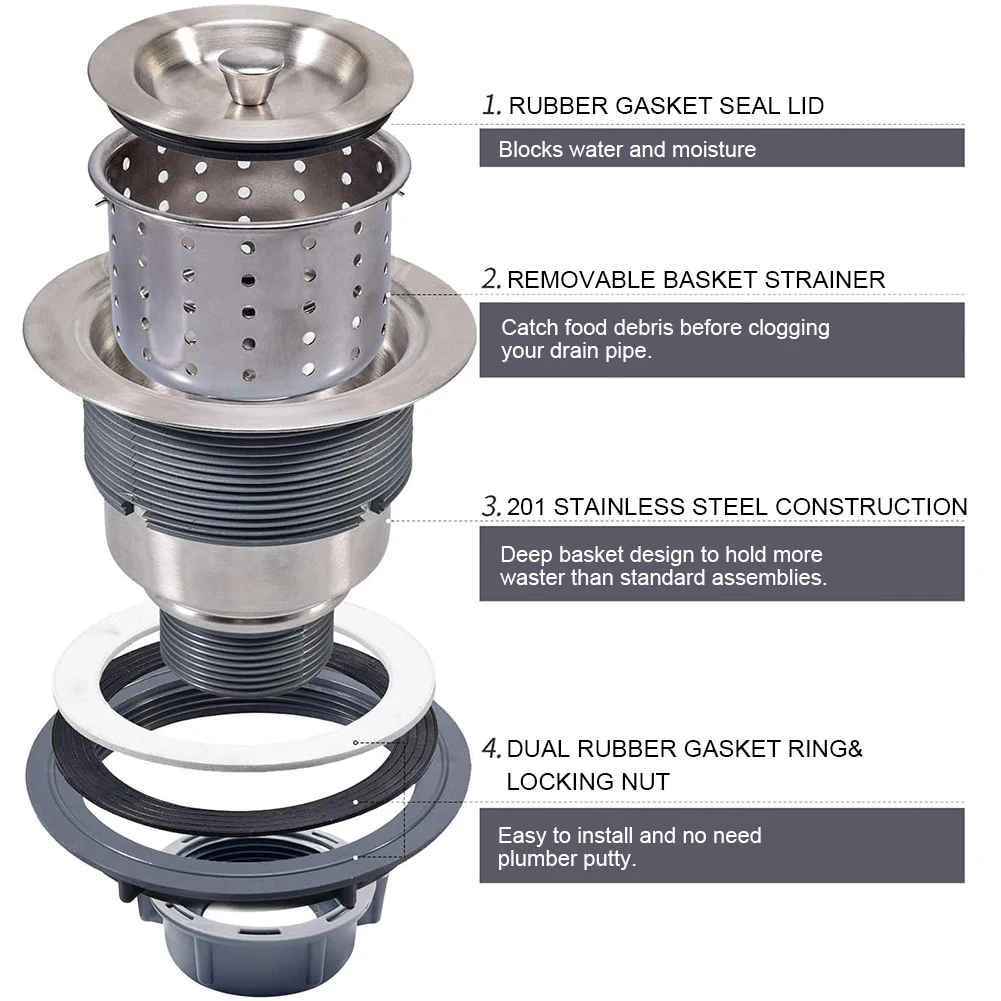 * 3. Съемная отдельная глубокая корзина предотвращает засорение сливной трубы. (Примечание: он не может быть подключен к утилизации мусора.)