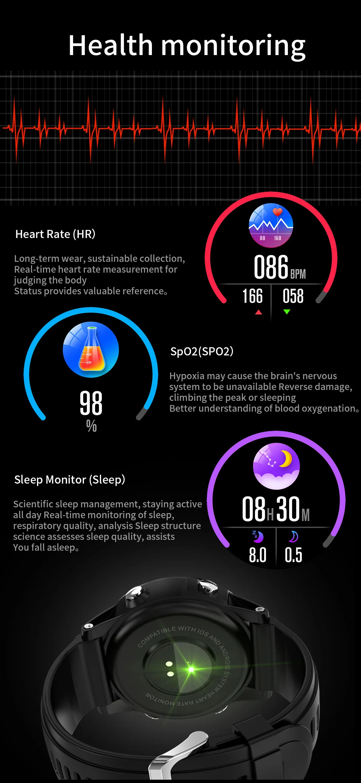 Дополнительные функции: пульсометр, мониторинг сна, удаленная камера, секундомер, улучшенный яркий экран, умный будильник,