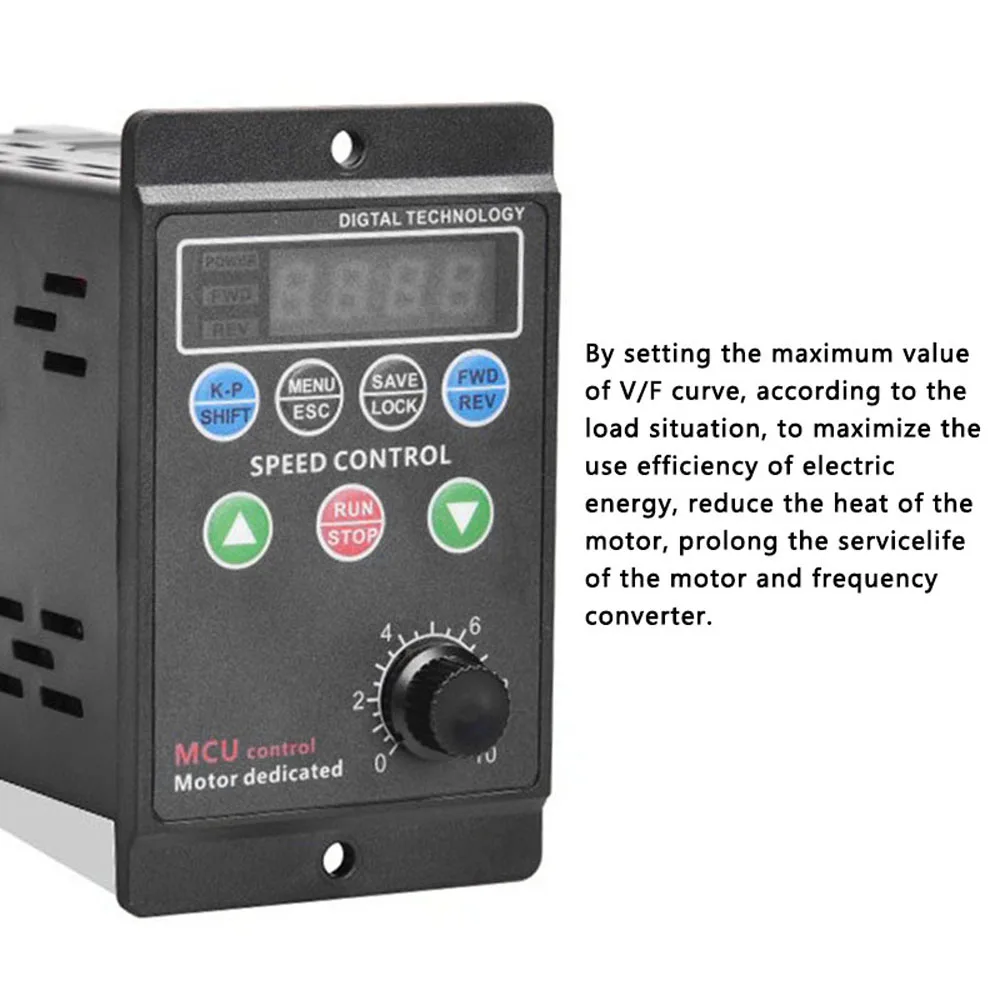 The is a single-phase 220 V voltage input frequency converter to drives a three-phase motor (be sure to convert the connection method into a t-riangle type). Four-digit digital tube display, output 1.0-99.0Hz, in order to improve the output voltage, this product uses SVPWM modulation mode, carrier-frequency 8.0KHz. Suitable for motors below 750W, the maximum output power is 1100W.