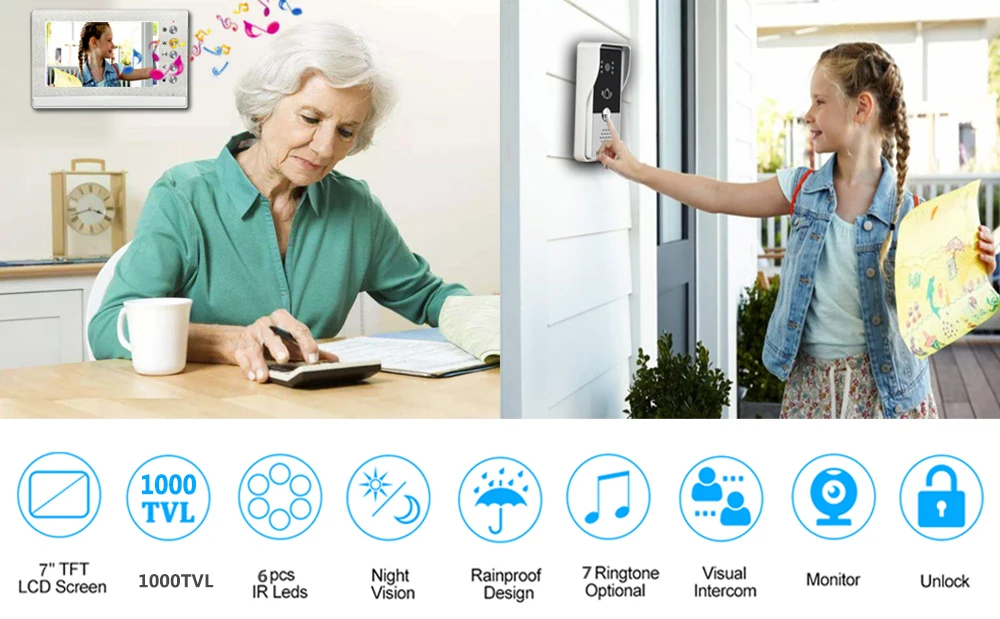 Эта система видеодомофона включает в себя 1-наружную цветную камеру, 1-цветной ЖК-экран 7 дюймов.