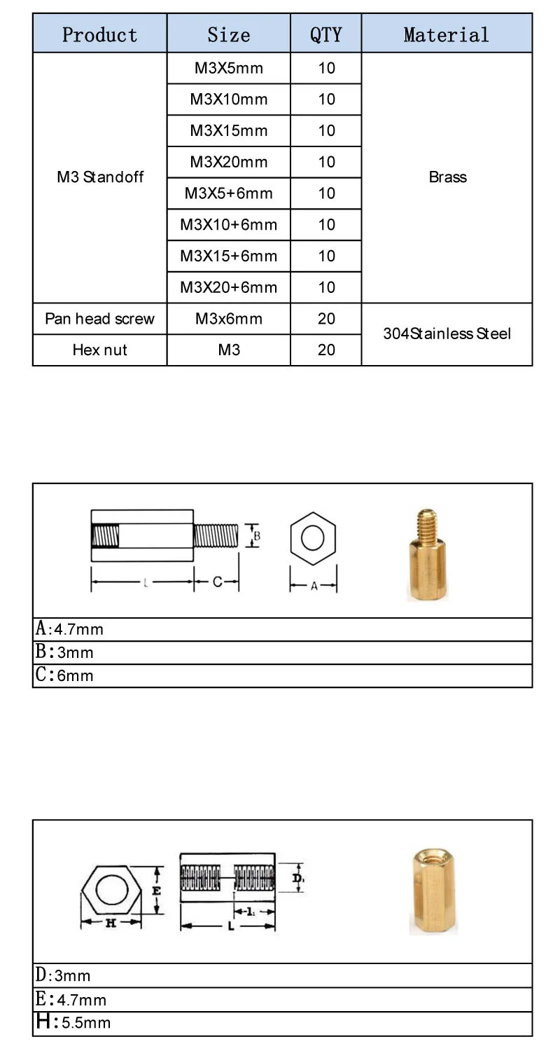M2 M3M2: рифленая латунная стойкаВнешний диаметр: 3,2 ммM3: Шестигранная латунная стойкаДиаметр резьбы: 3 ммПротивоположная Шестигранная сторона: 4,7 ммДлина внешней резьбы: 3 ммРазмер: M2 M2, 5 M3 M4Тип: шестигранный + рифленыйМатериал: латунная стойка и винт и гайка из нержавеющей стали 201