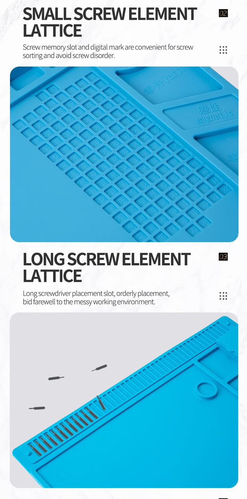 5. «Многофункциональная в одном»: слот для чипа материнской платы, небольшая винтовая компонентная сетка, длинная винтовая компонентная сетка, отверстие для размещения отверток, крышка компонентной сетки, магнитная компонентная сетка, И двойные весы в рабочей зоне