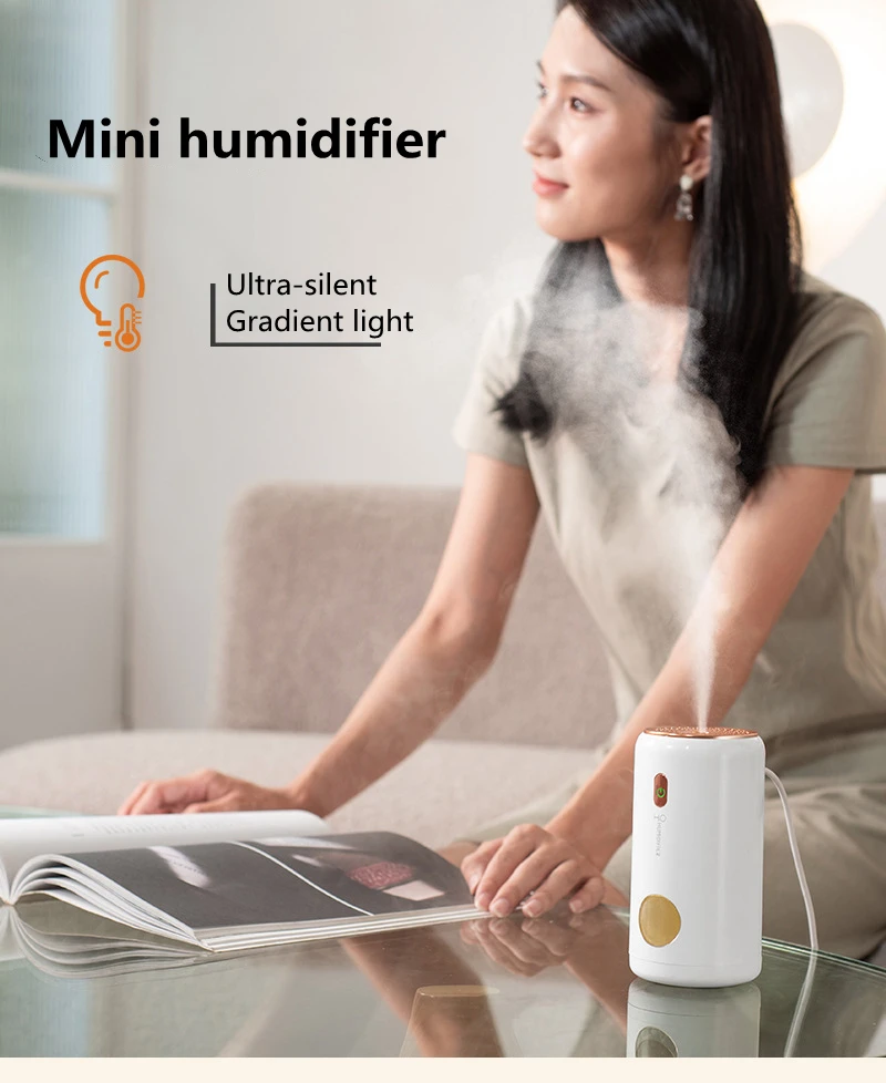 Зеленый индикатор кнопки загорается, светильник меняет цвет сверху, резервуар для воды яркий, включен режим непрерывного распыления.