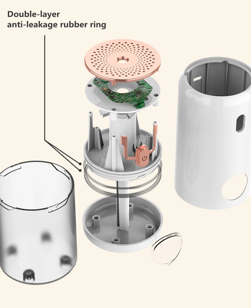 Зеленый светосветильник индикатор кнопки и светильник резервуара для воды горит, цветной светильник сверху продолжает постепенно меняться, включается прерывистый спрей (распыление на 3 секунды и остановка на 3 секунды)
