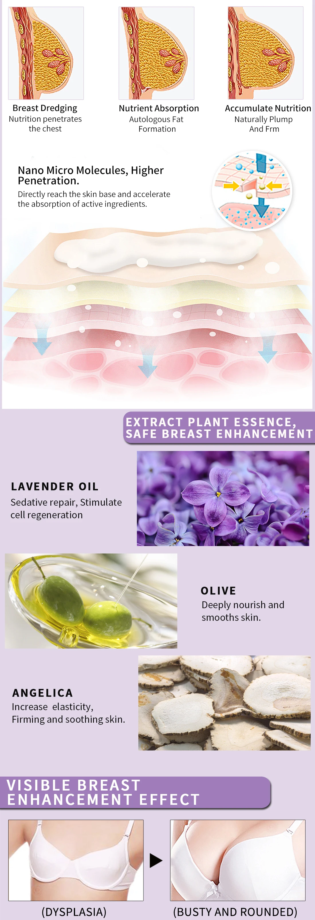 Богатый активными ингредиентами, извлечение экстракта лаванды, через массаж, богатые питательные вещества полностью впитываются в грудь, способствуют развитию груди снова, питают и укрепляют кожу, укрепляет эластичность кожи, делает кожу более гладкой, чтобы достичь богатой рифмы и красоты молока.