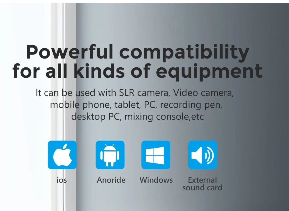 1. Совместимость с зеркальной камерой, видеокамерой, мобильный телефон, планшет, ПК, записывающая ручка, настольный ПК, микшерная консоль и т. д.