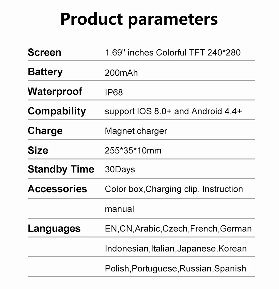 Main Features: Multi-Sport, Continuous heart rate monitor,HR Alert, Body temperature(realtime),DIY watch face
