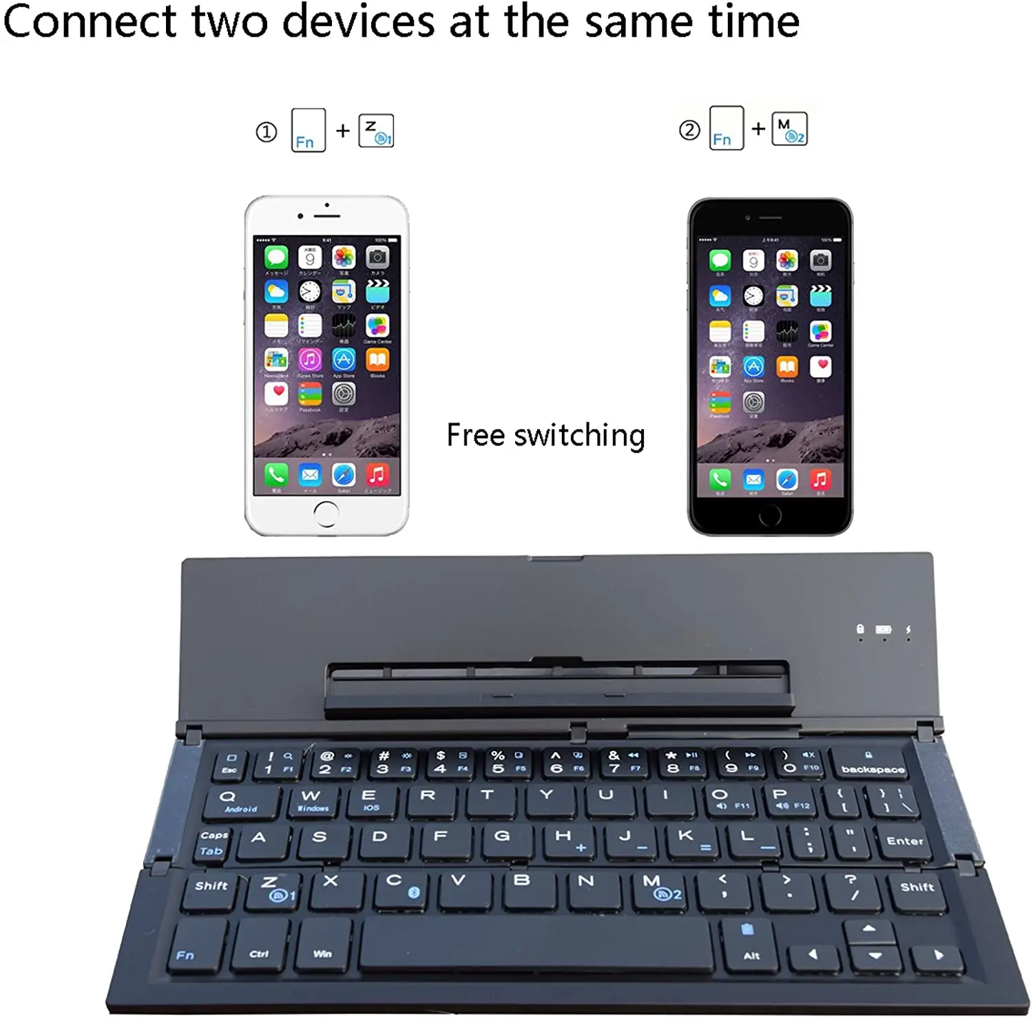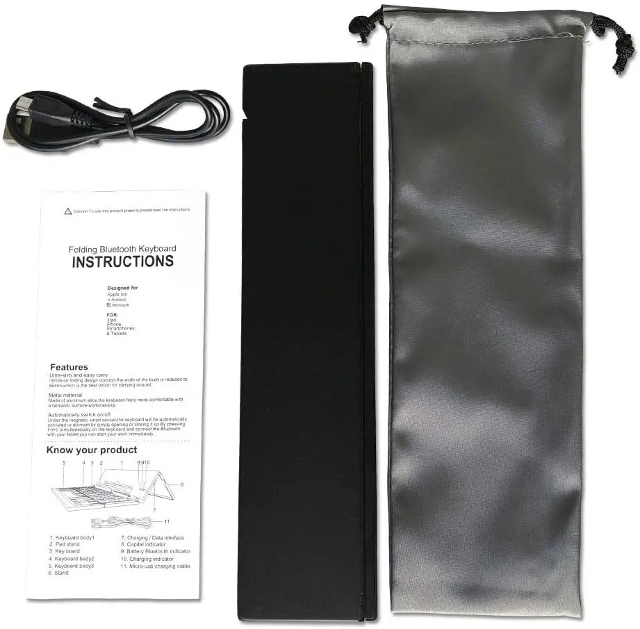 Корпус из алюминиевого сплава с подставкой: В отличие от других аналогичных дизайнерских пластиковых клавиатуры, этот портативный складной беспроводной корпус клавиатуры BT изготовлен из алюминиевого сплава делает его гладким и роскошным. Встроенные подставки для хранения и поддержки вашего устройства, вы можете использовать ваши планшеты и смартфоны под идеальным углом обзора.