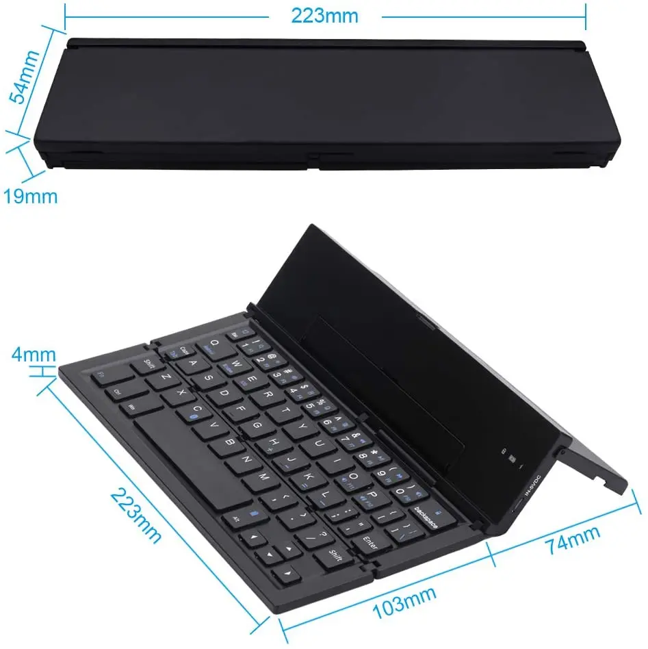 Ультра-тонкая и легкая: Размер складывания этой Портативной Беспроводной bluetooth-клавиатуры: .16*8,74*0,78 дюймов, размер в разложенном виде: 6,69*8,74*0,23 дюймов, вес составляет всего 7,05 унции. Инновационный, стильный и магнитный складной дизайн можно легко положить в кошелек, сумку или карман