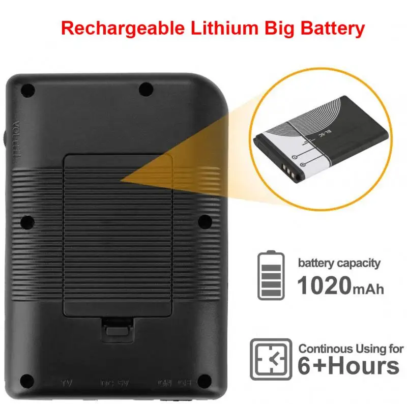 Перезаряжаемая батарея большой емкости-по сравнению с другими портативными игровыми консолями в стиле ретро с емкостью 600 мА · ч или 700 мА · ч, наш мини-портативный игровой плеер в стиле ретро, встроенный литиевый аккумулятор большой емкости 1020 мА · ч. Поставляется с usb-кабелем plug & play, игра может играть до 6 часов каждый раз, когда она полностью заряжена. Когда вы находитесь в деловой поездке, путешествии, кемпинге, вам не придется беспокоиться о том, что у вас нет энергии.